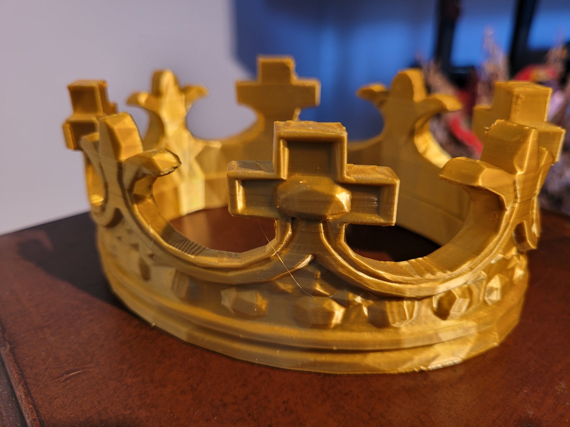 The statuette is supported at its base by a black stand, which itself has a decoration with a drawing of the king's crown.